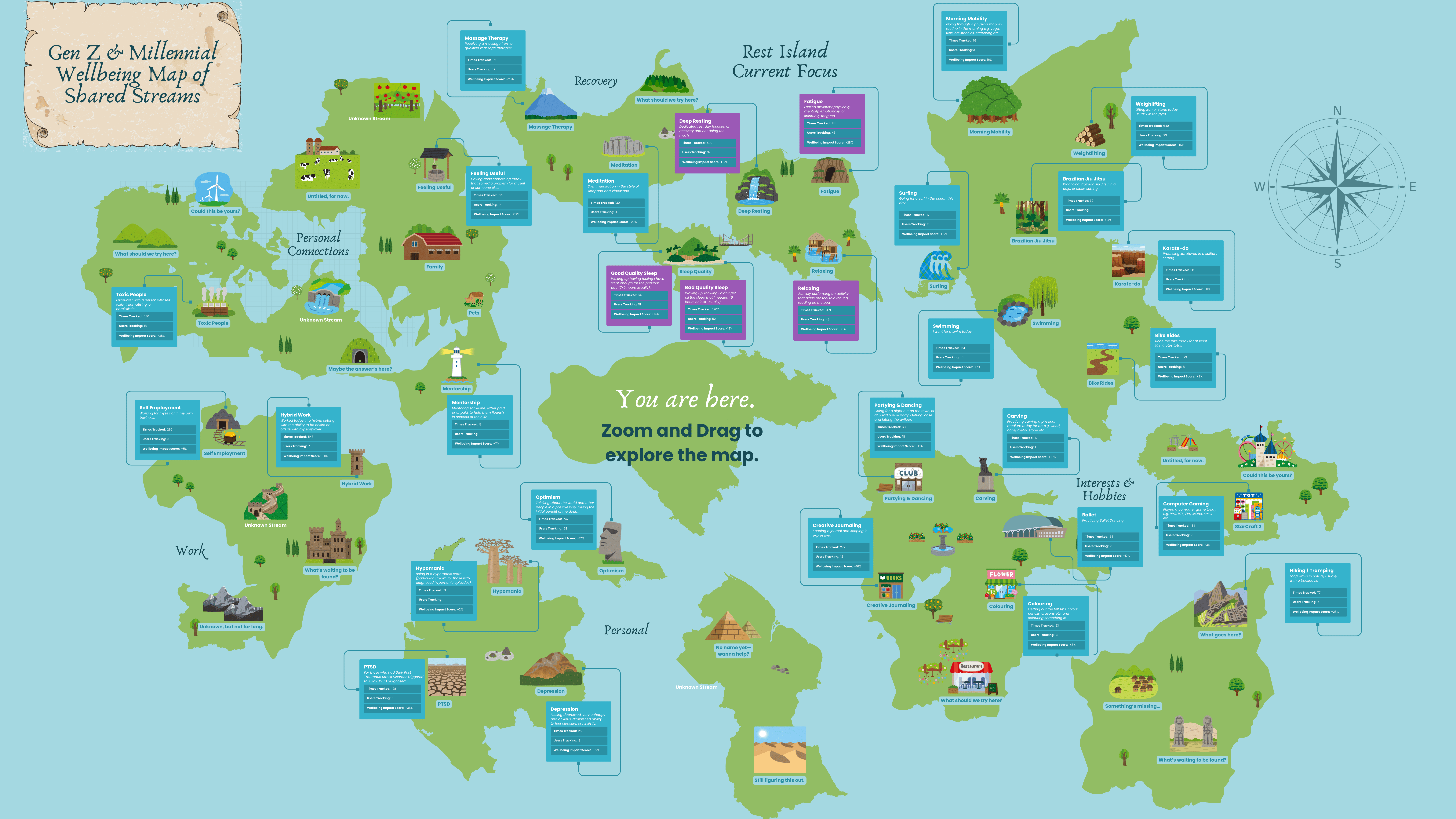 The current community focus is Rest Island, a location where we can map out the impact of sleep, recovery, relaxation and fatigue. If you would like to join us in exploring this location – please see our community page here (link).